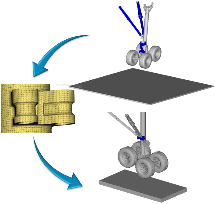 了解起落架在觸地撞擊過程中,主要受力部件的應力分布與數值,若初始設計強度不足,則以最佳化技術輔助,期望能在增重幅度最小的條件下,有效提升結構強度。