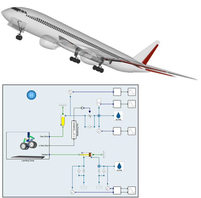 以液壓控制與機構模擬進行系統級的分析,了解起落架收放的運動模式、軌跡、各階段作動時間與致動器出力,是否滿足收放功能的要求,以篩選設計上各制動元件使用的規格,或是評估油路設計是否合理。
