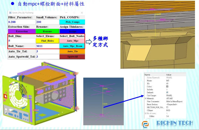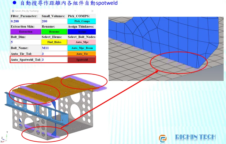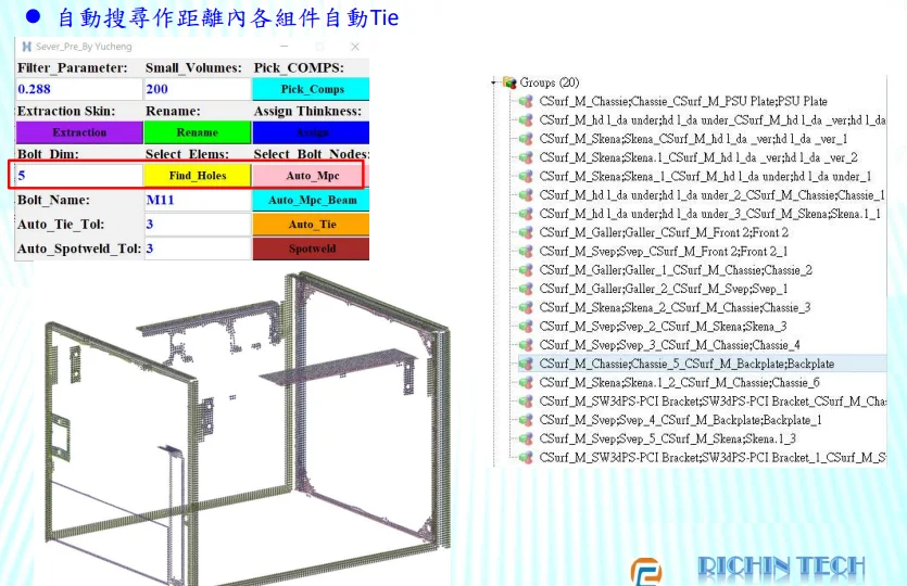 自動完成以下動作: 取中性面、設定厚度、螺栓組裝、Tie設定、SpotWeld...等