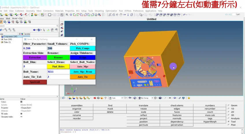 本次專案我們針對電子業客戶建模的痛點,彙整 HyperMesh 強大的網格功能,再搭配瑞其科技開發的客製化程式,已成功讓伺服器、NB、滑鼠、鍵盤…等電子產品,降低超過70%以上的建模時間。