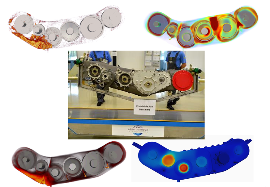 In this project, Altair nanoFluidX was used to analyze the lubrication and cooling performance of a high-speed gearbox for an aerospace engine. By observing the simulation results—including lubricant distribution, the fountain effect between gears, and local hot spots—we optimized the number and placement of oil injection ports, as well as the flow rate and velocity at each port, ensuring that all regions operate within safe temperature limits.