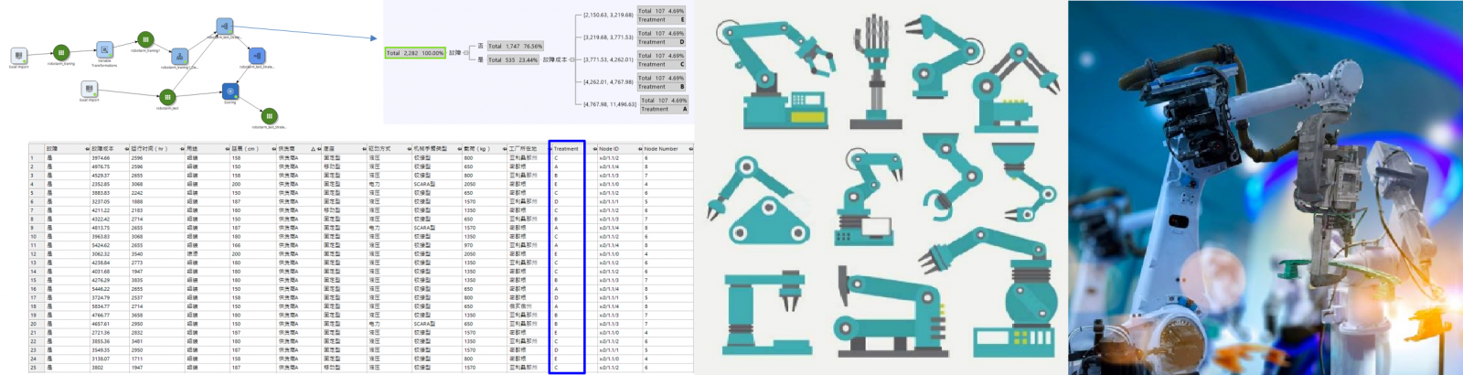 .......By using Knowledge Studio and RapidMiner, based on the collected robot data, including operating time, application, drive type, arm length, arm type, etc., an AI prediction model was trained. This prediction model is used to predict robotic arm failures and ultimately establish a complete maintenance schedule.