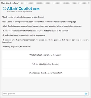 - Altair Copilot (AI assistant): a brand-new AI support assistant that understands multiple natural languages and answers questions entirely based on Altair online help and other Altair knowledge resources.
