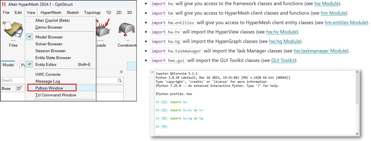 - Python and HyperWorks are fully integrated: the Python 3.8.10 distribution included in the HyperMesh installation directory contains hundreds of popular packages and libraries such as Pandas, NumPy, SciPy, TensorFlow, openpyxl, Matplotlib, and more.