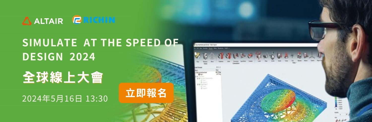 2024年5月16日下午 13:30,來自全球不同行業的知名企業同行與 Altair 的科技專家們將一同探討:如何利用模擬軟體加快產品研發速度、CAE 模擬技術和有限元分析科技的應用,如何在產品研發中實現降本增效。
