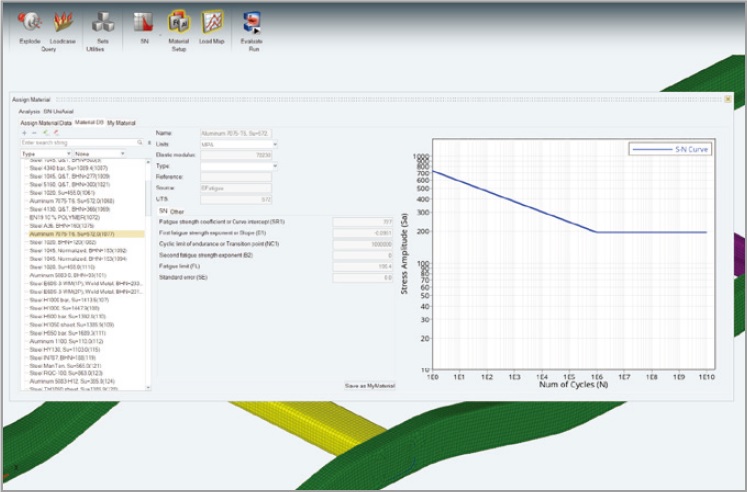 Hyper Life 提供了材料資料庫,使用者可選擇其中的材料賦予到相應的構件,也可以根據需要改變材料資料。可通過 UTS 估算材料的疲勞壽命。用戶也可創建自己的材料。