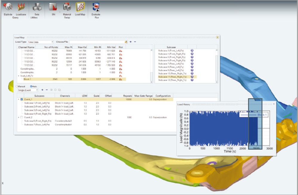 LoadMap 工具提供了簡單可靠的信號處理功能。疲勞事件可自動、也可手動將工況和載荷歷史聯繫起來,支援常用的載荷歷史檔,如 DAC、RPC 和 CSV 檔,正弦曲線及簡單載荷曲線可快連生成。