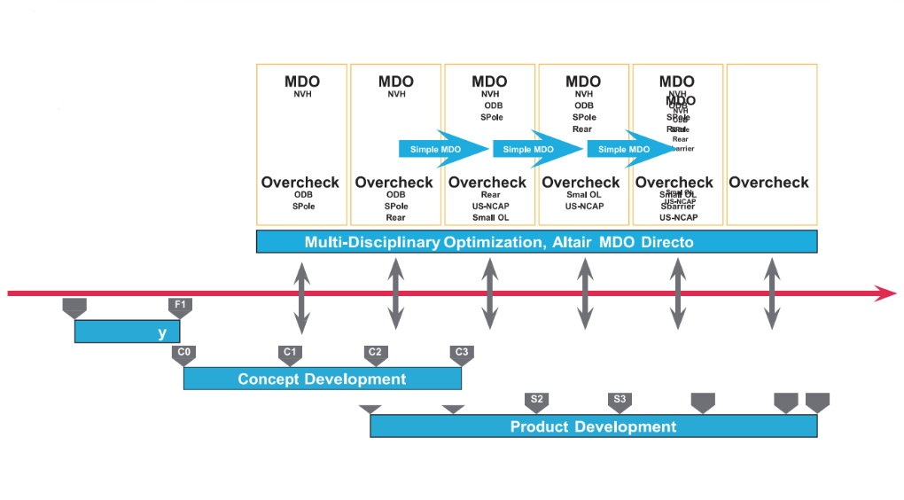 MDO Director 可以貫穿產品開發流程的各種階段,從早期概念開發到後期系列開發,MDO Director 可以幫助生成設計輸入,以使待開發的產品更加成熟。在專案的早期階段和專案節點之間,MDO Director 可以以一種更加簡單與快速的管道,來獲取設計迴響。線上性工況下,如 NVH 和靜態剛度,使用線性優化。另外對碰撞和其他非線性工況進行校核。