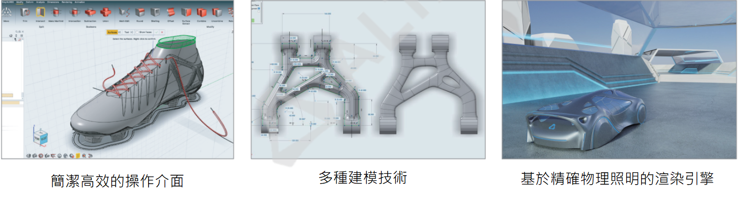 同時具備多邊形自由造型建模、實體建模和平滑連續 NURBS 建模方式