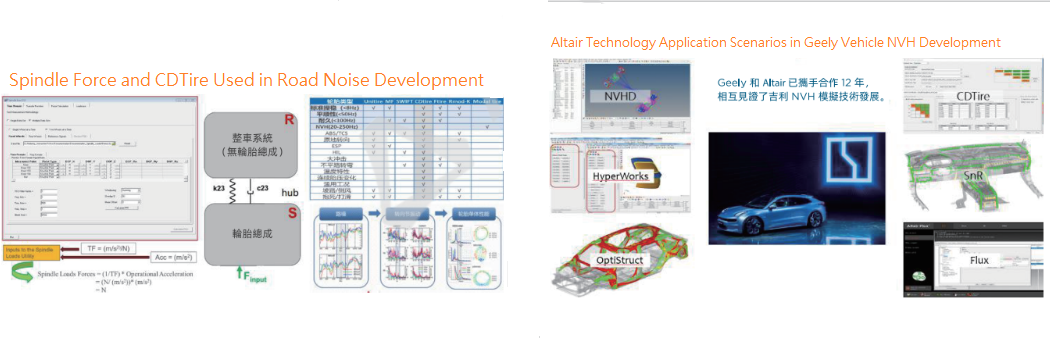 吉利汽車與 Altair 以合作12年,從早期的 HyperMesh 建模,到 NVHD 整車分析,再到 SnRD 異響解決方案,從結構分析到電磁場分析,相互見證了彼此在模擬領域的成長。NVHD 作為高度整合的整車 NVH 模擬分析平台,已經作為吉利整車 NVH 模擬分析的主要工具,從整車模塊建模、標準工況定義、後處理診斷,服務於吉利幾乎所有車型的 NVH 效能開發當中。