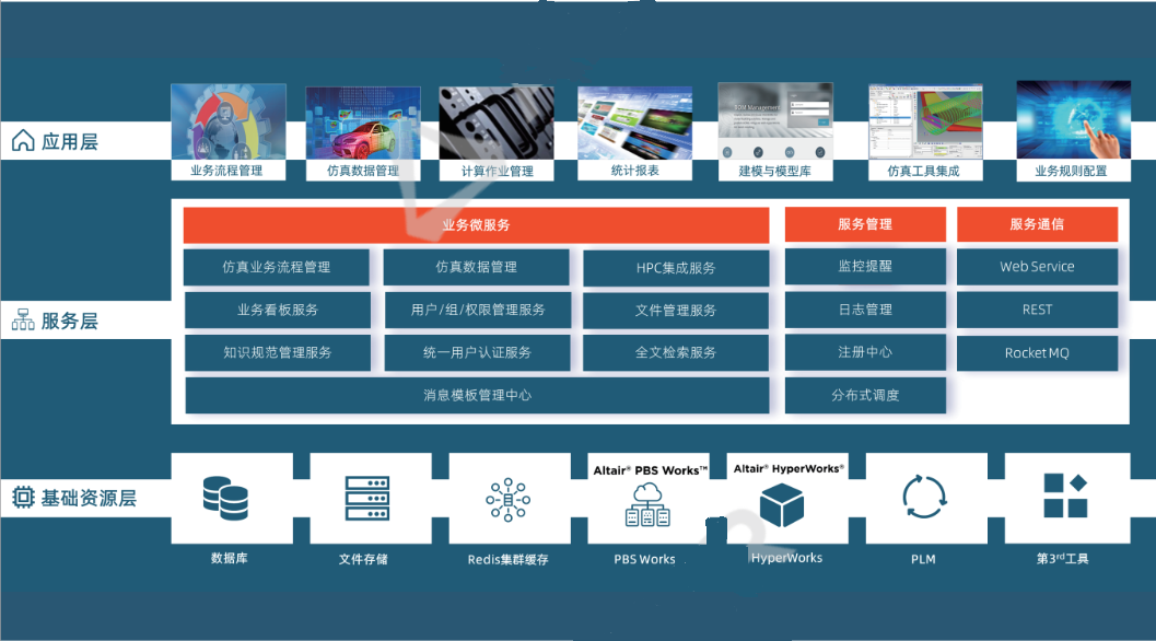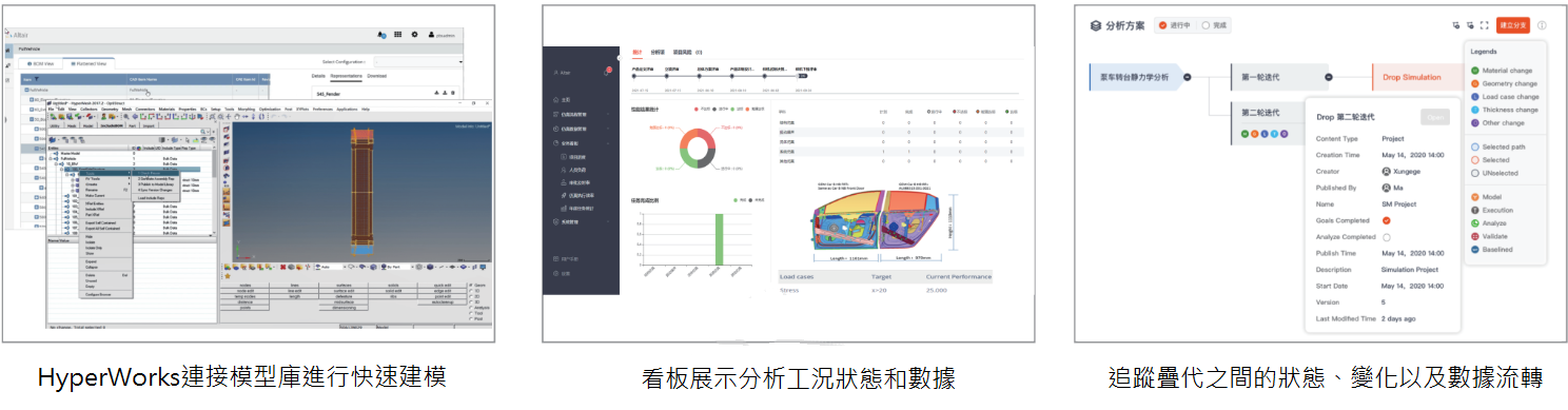 Altair Simulation Cloud Suite 允許用戶通過一個直觀且基於 web 的門戶管理,去模擬專案的整個生命週期。從產品研發流程中設計與模擬協同任務的規範化梳理,分析項目的自動化,標準化創建開始,到設定各方向分析任務的關鍵性能目標( KPT )、建模、提交計算、提取關鍵的性能指標( KPI ),以及後續的結果驗證和強大的看板展示功能。