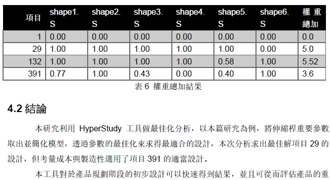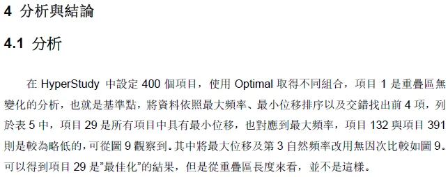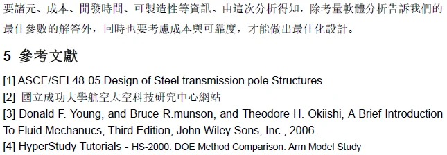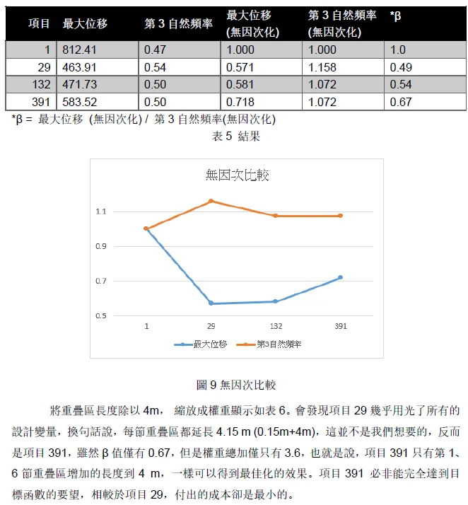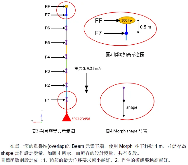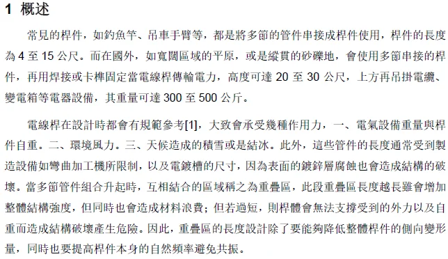 摘 要 .......本文探討多節管件互相串接時,之間的重疊區域長度,對於整隻桿件的側向位移跟模態的影響。當重疊區過長,會浪費材料且增加自重,太短又會應力集中導致大變形。故將重疊區長度當作設計變數,利用側向位移及自然頻率當作輸入響應,把側向位移最小化以及自然頻率最大化當作優化目標,求得最佳化長度。 Abstract .......The main purpose of the study is that to investigate different overlaps length in telescopic tubes, the length affects its lateral displacement and natural frequency. When the overlap area too long it will waste too much material and become heavier, when it's too short, it will let stress concentration and lead to large displacement. |