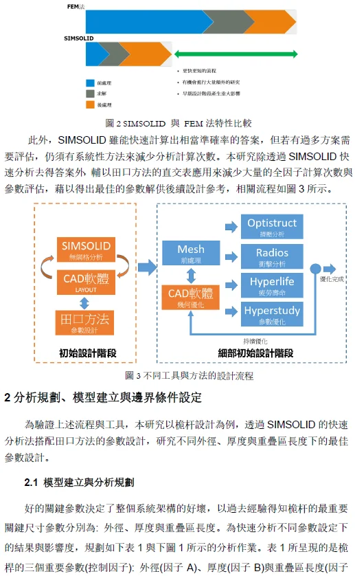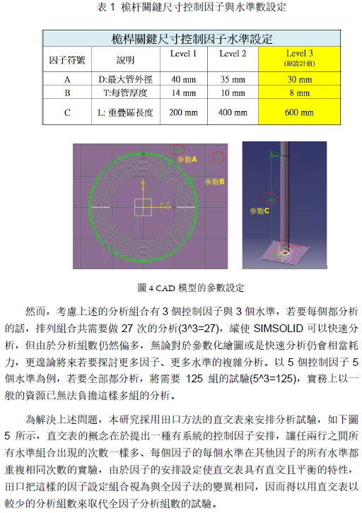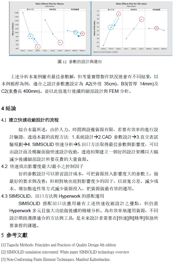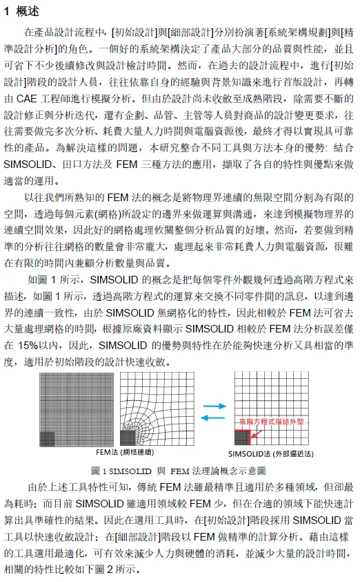 摘 要 .......產品設計流程中,[初始設計]決定了整個系統架構的可靠度。然而,在過去[初始設計]階段的設計人員,往往需要花費大量的資源做反覆設計與分析的迭代,最終才得以收斂出具可靠度的產品架構。為解決資源耗費過大問題,本研究結合不同的工具與方法,於[初始階段]採用SIMSOLID與田口方法做快速收斂設計;並於[細部設計階段],再來執行精準的CAD製作與FEM計算,以有限的資源下透過不同的工具與方法的整合,來可減少人員、時間與硬體的資源損耗。 Abstract .......During the product design process, Initial design often determines the reliability of system. However, designers often spend numerous resource in design and analysis at this stage. In order to solve the problems, the research combines different tools and methods. Using SIMSOLID software and Taguchi method to quickly converge the design, and using FEM method to evaluate the design in the detail design stage. Through the combination of different tools, the consumption of resources will be reduced effectively. |