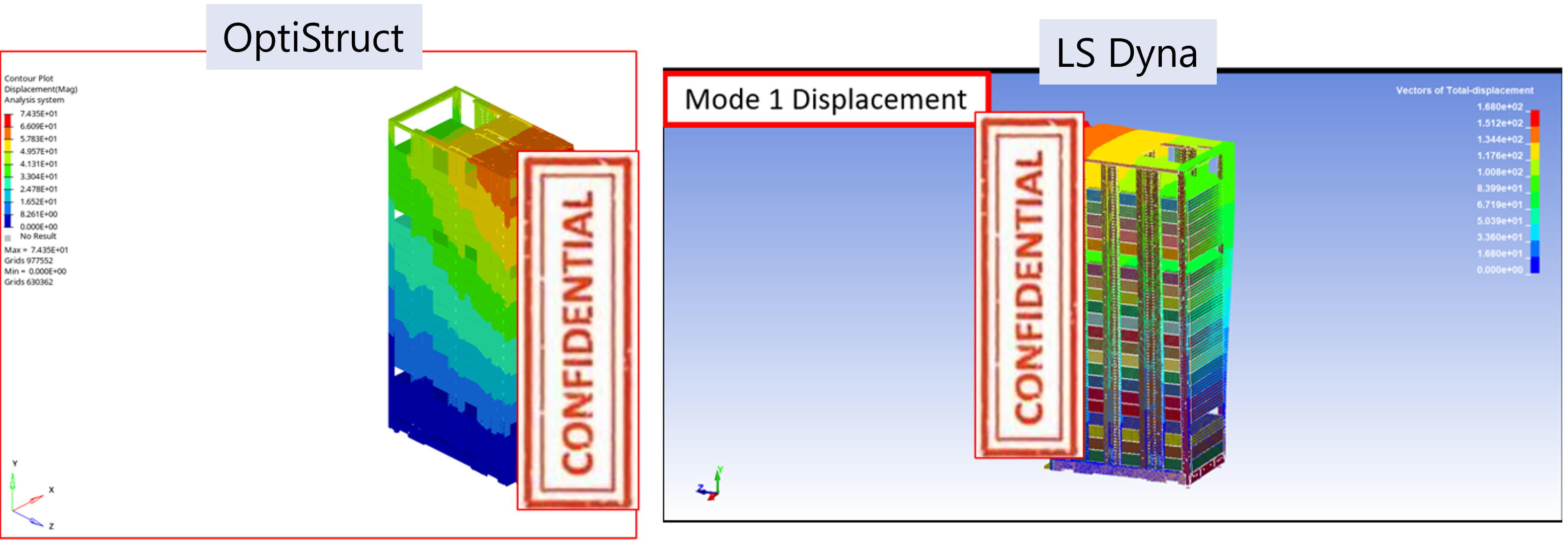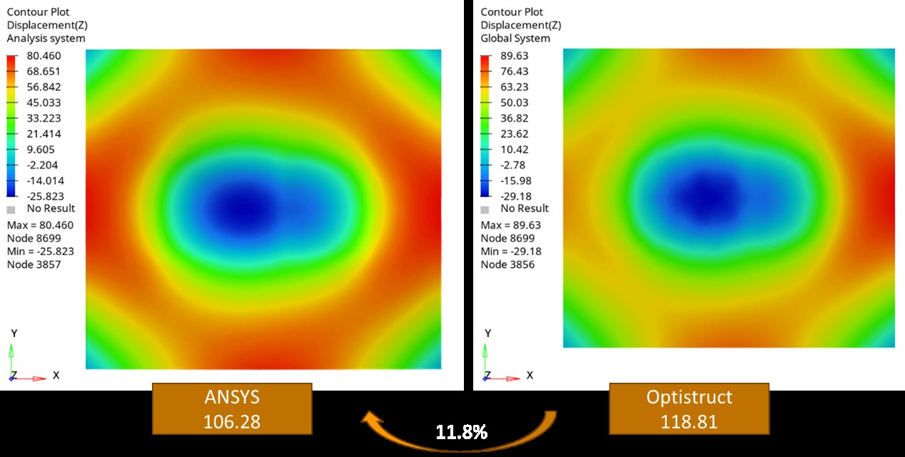 透過在 OptiStruct 中啟用 CTE 修正功能,其室溫翹曲分析結果與 Ansys 幾乎一致,位移差異僅約 0.2%,結果驗證 OptiStruct 具備可靠的熱應力分析能力,可作為提供可靠的設計趨勢參考與決策依據。
