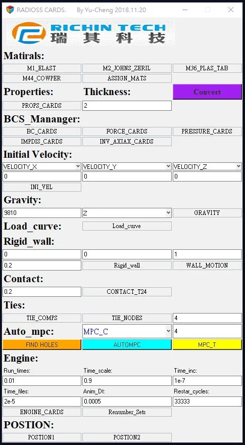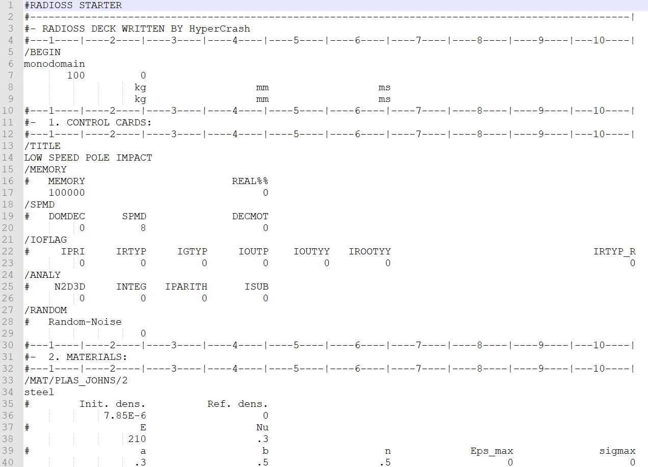 利用文字編輯器,直接對Radioss專屬rad檔案進行編輯,以撰寫腳本方式提供求解器分析步驟。