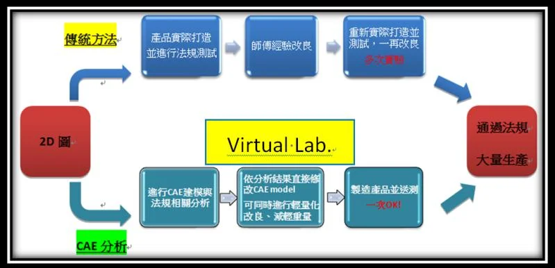 .......過去產品在通過測試要求時,需將產品送到實驗室中進行測試,若是測試NG,則需重複進行Try & Error。「CAE虛擬實驗室」目的在於,藉由正確、可靠的分析方法,在產品設計的階段就能知道測試的結果,並進行改良設計,大大降低產品試模及測試的時程。