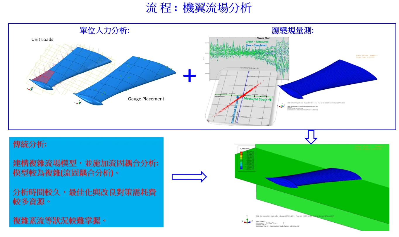 .......飛機飛航時的外力往往需進行複雜的空氣動力學分析(流場分析)才能模擬,但流場分析將難以考慮實際狀況的複雜紊流問題,因此若運用 True-load 可針對預關心位置黏貼應變規,進行飛機實測,並結合如上述各案例之流程,True-load 即可掌握此複雜流場入力資訊,以利後續機身、機翼等結構設計改良之運用。