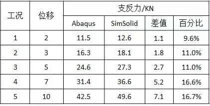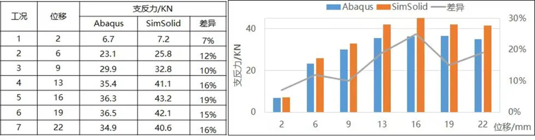支座反力的分析結果如表1所示,在位移較小階段,兩個軟體的結果相差約10%,隨著位移的增加,材料非線性及幾何非線性越來越大,兩者的結果差異也隨之變大,這主要是由於 SimSolid 非線性預設設定應用場景為小量塑性應變,但是總體趨勢完全一致,並且差異比較穩定,在可接受範圍以內,這一點在工程應用上很關鍵,也完全能滿足結構前期設計的需求。