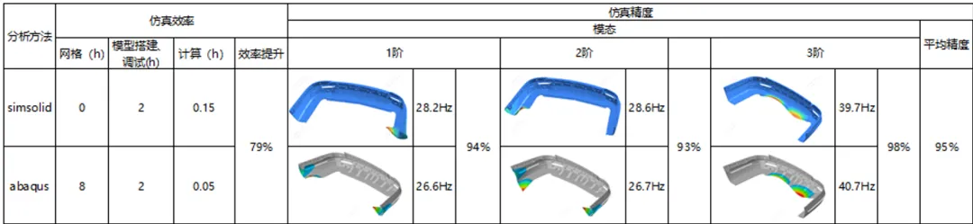 模態分析結果顯示,SimSolid 分析總時長僅需 2小時,相比有限元可以提速 79%,提速主要原因是 SimSolid 不用進行幾何簡化和殼網格劃分;結果對比顯示。前三階固有頻率平均精度 95%,精度滿足快速校驗使用。
