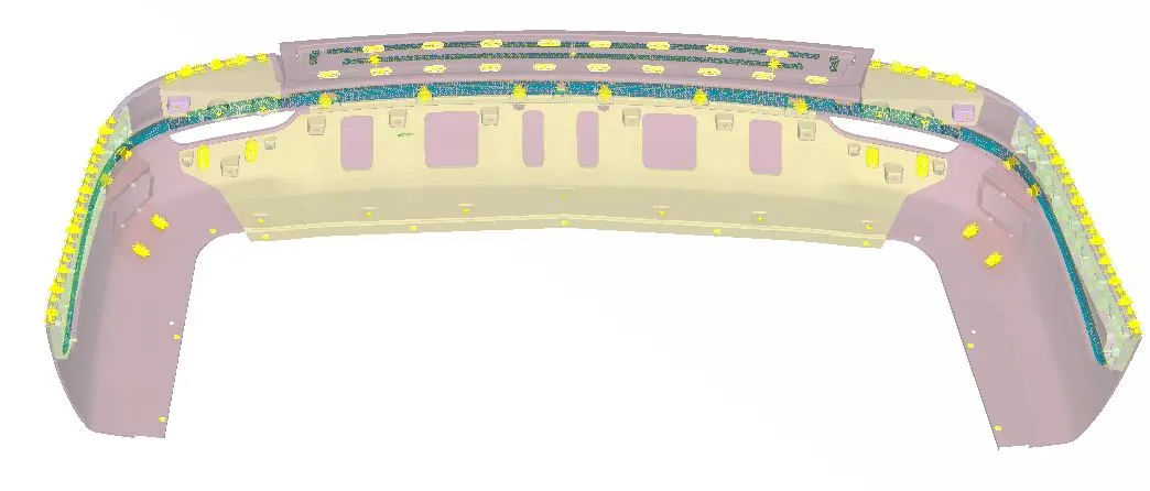 選取某車型的後保險桿,開展了模態及面剛度分析。後保險桿連接點數量較多,包括螺栓、卡扣等。採用傳統有限元方法需要手動定義簡化的剛性連接 MPC,耗時較長,如圖6所示。SimSolid 通過定義搜索間隙及容差,可實現高效的自動連接,接觸類型為綁定,接觸解析度增強,如圖7所示。