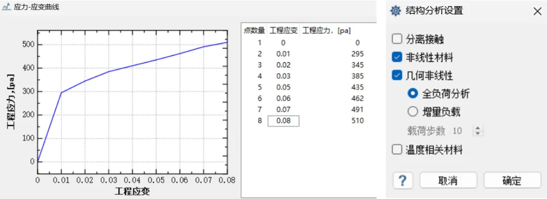 由於分析過程涉及非線性,其材料非線性及幾何非線性的設置如下圖2所示: