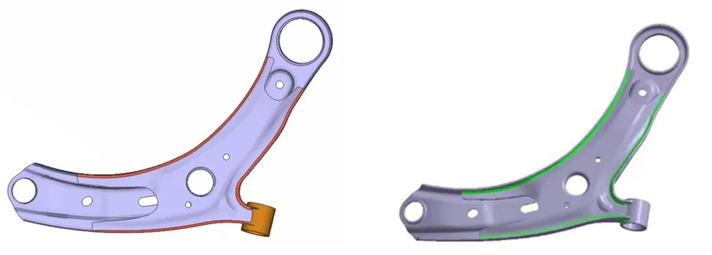 選用了典型的底盤件前下控制臂,該零件涉及『衝壓、焊接、鍛造成型工藝』,同時從『實體下控制臂結構』和『板殼下控制臂結構』兩方面驗證軟體的精度。分析過程涉及到材料非線性和幾何非線性。