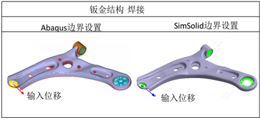 採用鈑金焊接擺臂結構,在擺臂球銷位置,施加不同的位移,提取相應的支座反力的分析結果和結構應力,對比軟體的非線性分析精度。如圖3所示: