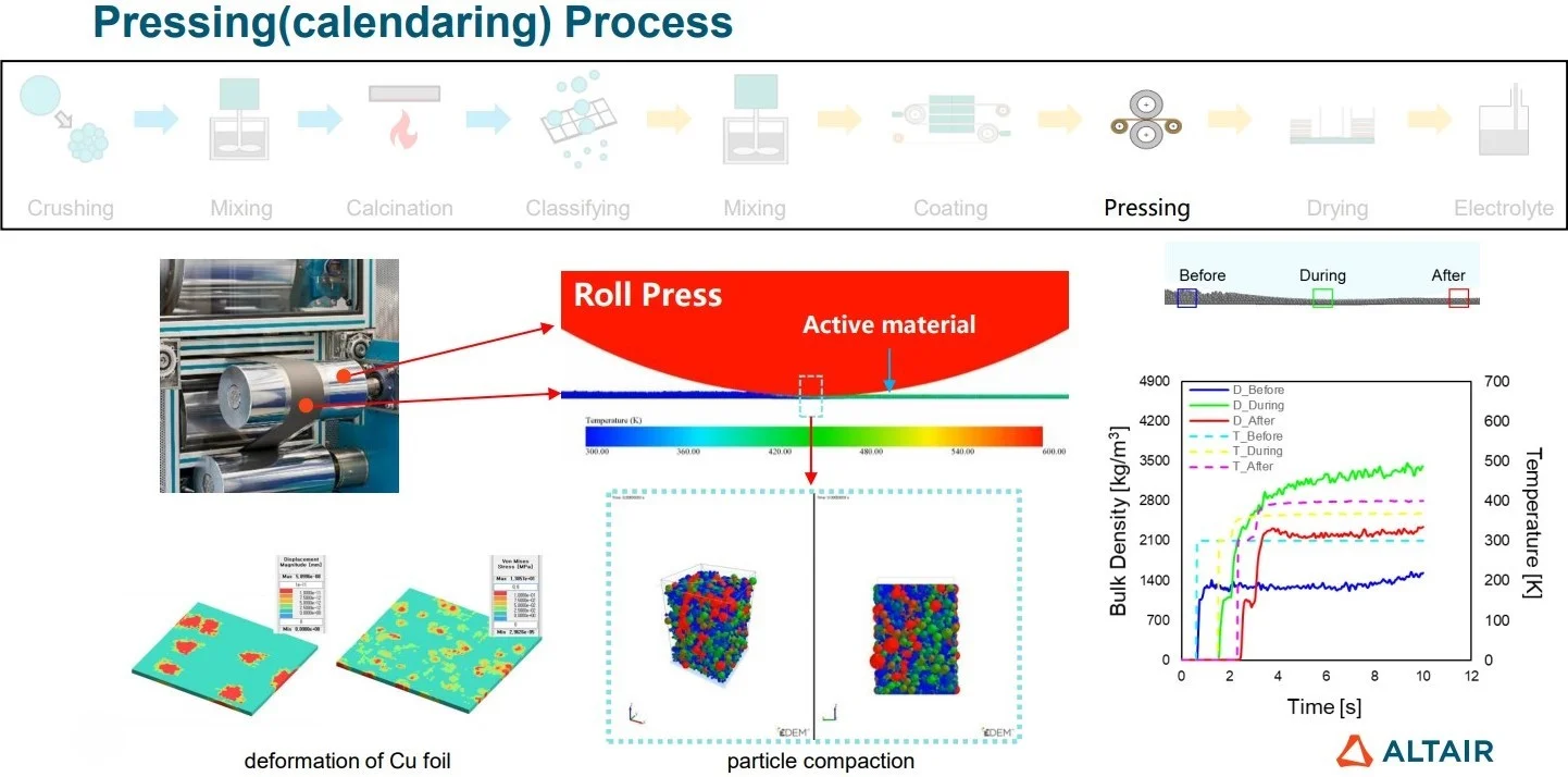 壓延是鋰離子電池製造中的關鍵步驟,對電極的孔隙結構和電化學性能有重大影響。利用EDEM技術,可以模擬壓延過程,幫助預測和優化電極材料、組成和厚度的影響。這不僅提高了製造效率,還減少了成本。