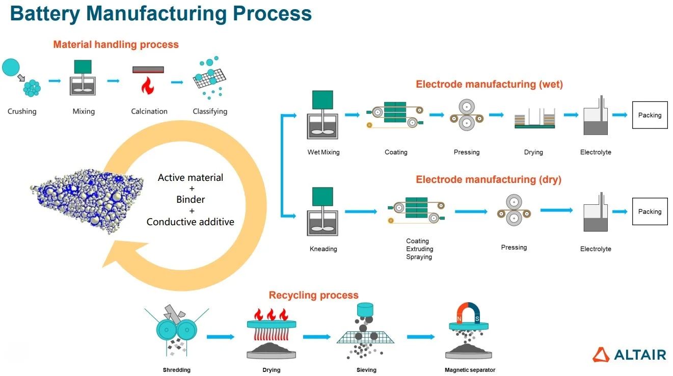 EDEM技術可全面模擬電池製造過程,包括粉碎、混合、篩分、壓實、煅燒、乾燥、分離等,幫助優化工藝流程。從活性材料(Active material)、黏合劑(Binder)和導電添加劑(Conductive Additive)的處理,到電極製造與回收,精確預測各步驟影響,提高效率並減少成本。