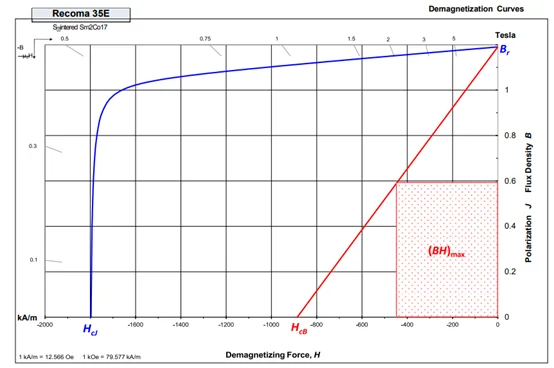 BHmax最大磁能積:最大磁能積是一個磁性材料在磁路中能夠提供的最大能量。藉由這個特性能夠判斷磁鐵的性能,是一種磁鐵能量密度的指標。