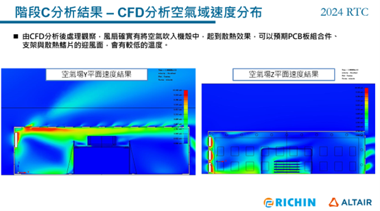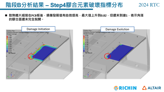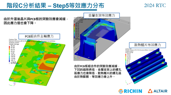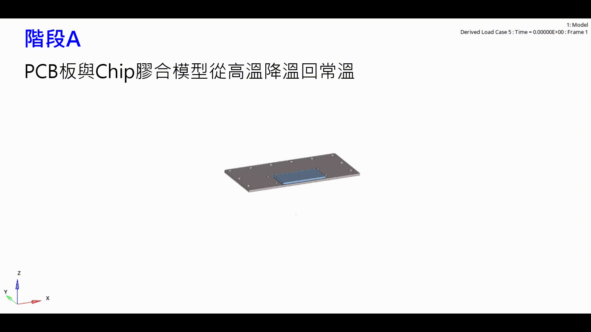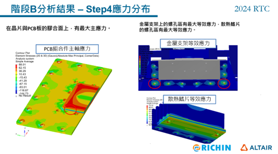 本階段考慮前述組裝所累積的結構狀態,進行工作狀態的結構熱應力分析。此階段需經由CFD計算穩態溫度分布後,將溫度映射結構模型執行熱應力分析。主要關心在考慮前述過程後的工作狀態下,PCB是否會有脫膠風險。