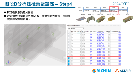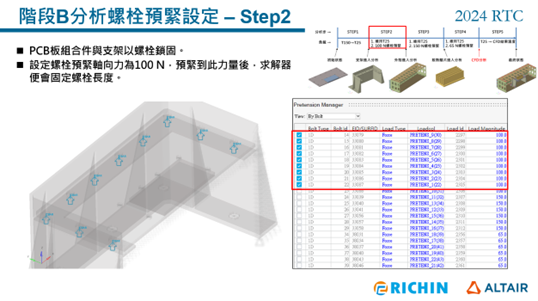 本階段模擬各組件的組裝過程,包含PCB板組合件與支架組裝、支架與外殼組裝以及PCB板與散熱鰭片組裝,此階段除了關心各螺栓區域因預力造成的局部應力,也觀察組裝過程對於PCB的膠合,是否會有不良影響。