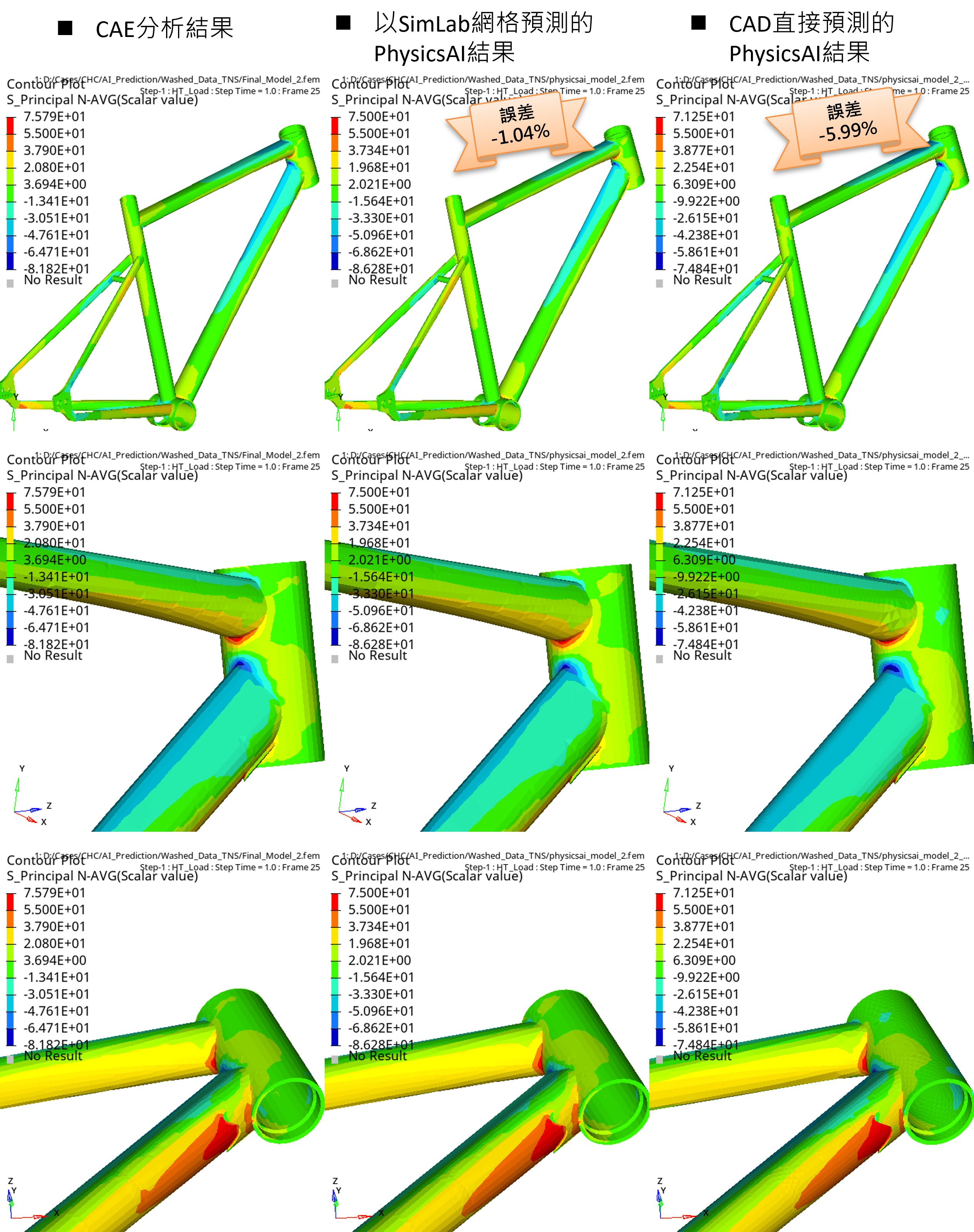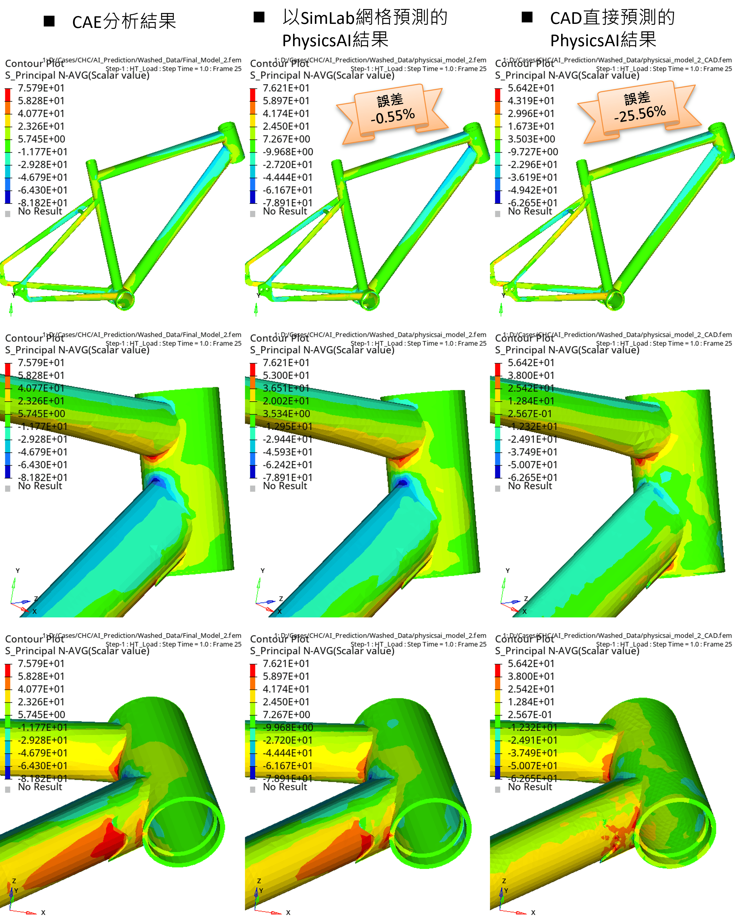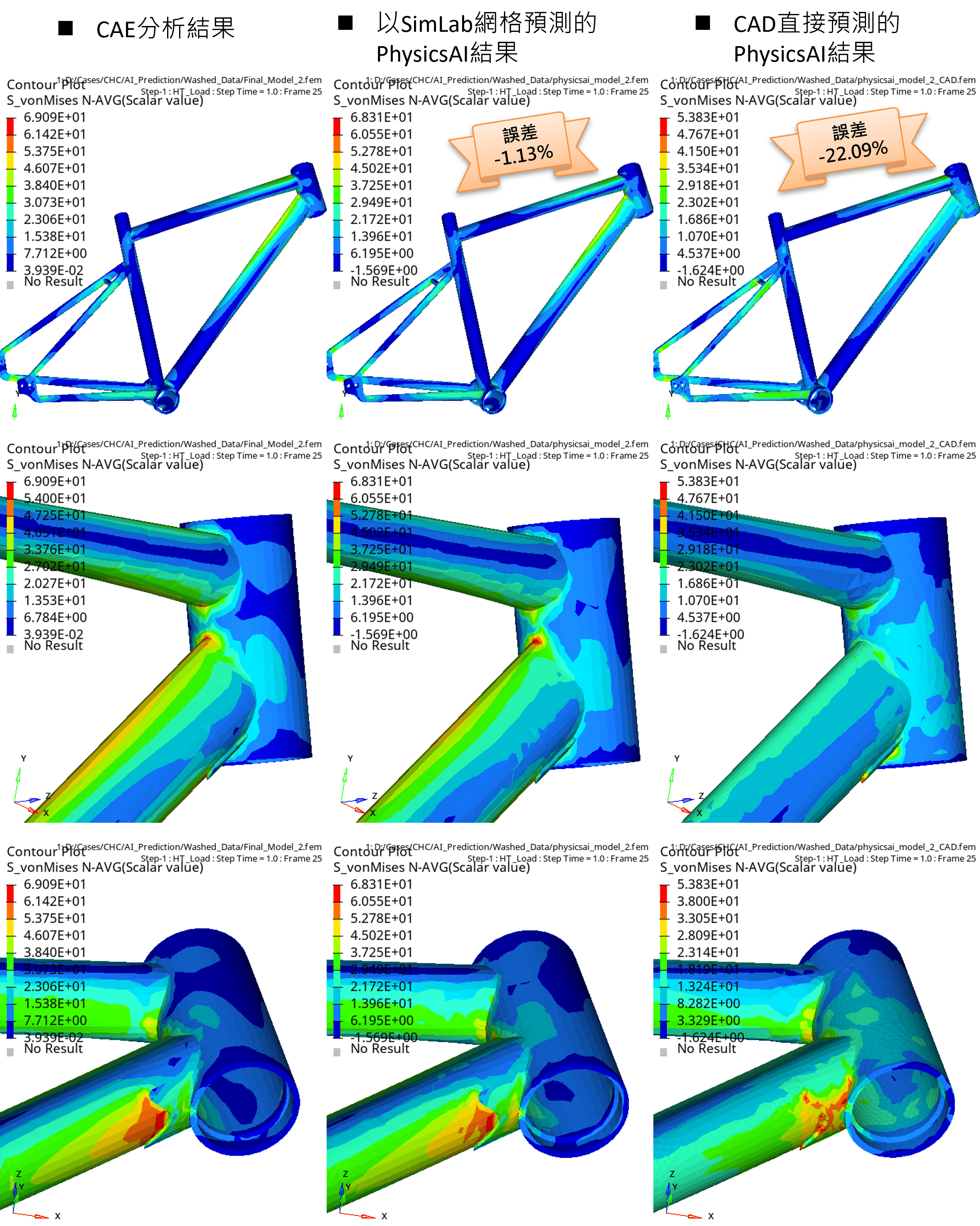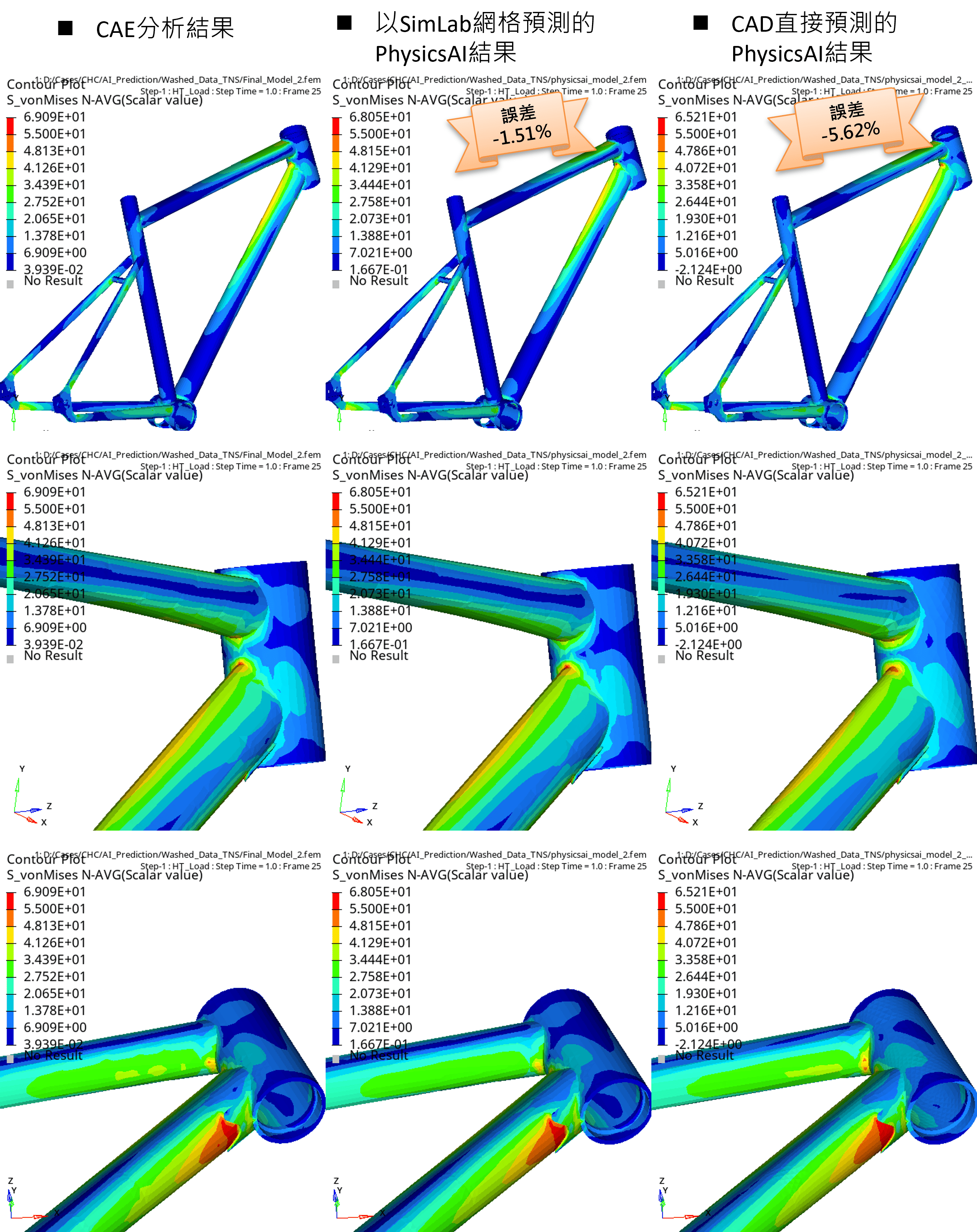 | CAE分析 | 手動網格的AI預設 | CAD的AI預設 | 手動網格/CAD預測誤差(%) | |