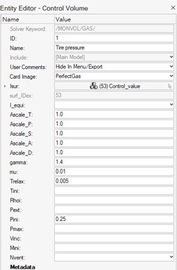 本文使用 Altair Radioss™ 中的 Monitored volume/GAS 功能模擬輪胎充氣效果,利用輪胎內側面及輪圈裝胎面建立一個封閉曲面作為輪胎充氣區域,並設定所有元素的法線向量朝外,如圖8所示,並設定實際測試時使用的胎壓為2.5 bar 及充氣時間0.005 s,再使用動態鬆弛的設定,使充氣模擬的過程呈現擬靜態,其餘參數則參考 Radioss 使用者手冊中建議的數值,Monitored volume/GAS 的相關設定如圖9所示。