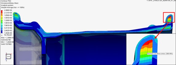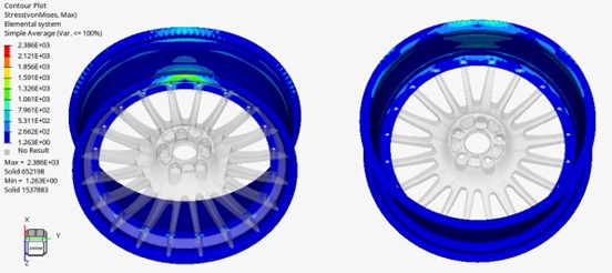 碳纖維胎環的最大 von Mises 等效應力分布如圖14及圖15所示,可以看到因為胎環的不同部位使用的疊層角度不同,因此各部位之間的應力差異比較明顯,從圖15的 CFRP 胎環剖面也可以觀察到應力不連續的現象。胎環的局部最大應力發生在輪圈內側輪緣處(Flange)的內部,最大等效應力值為2,386 MPa。