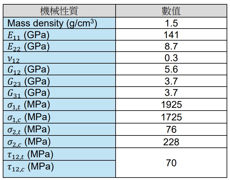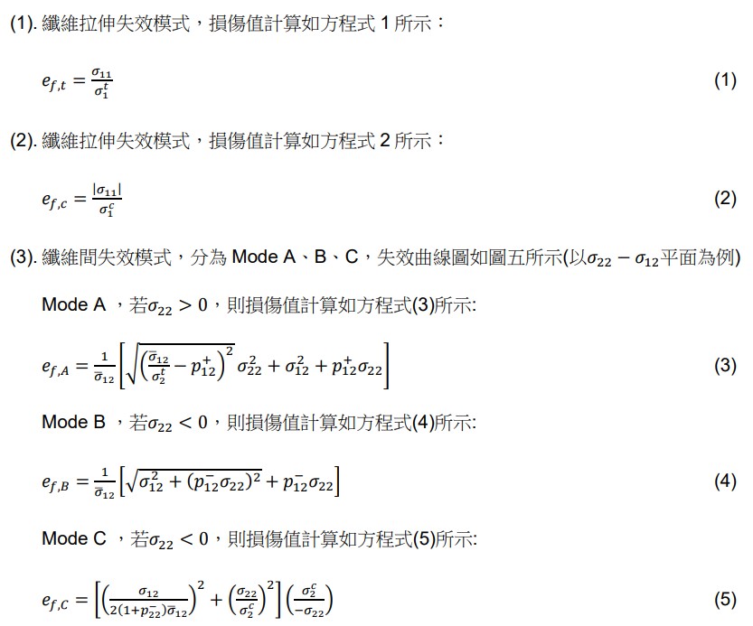 此外,本文也引入 PUCK 複材損傷理論來計算碳纖維在不同受力狀況下的損傷程度。PUCK 損傷理論將複材的失效分為五種模式,分別為纖維的拉伸跟壓縮失效、以及三種纖維間的失效模式。