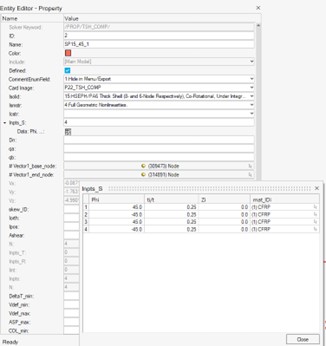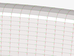 本文使用 Altair Radioss™ 中厚殼複材的 Property Type_22 TSH_COMP 進行碳纖維材料方向及疊層順序的設定,元素的纖維方向透過投影參考向量至元素內參考平面的方式決定,參考平面由元素內的座標軸決定,本分析以元素的X-Y平面作為纖維方向之參考平面,因此需要對齊各個元素內的座標軸,如圖5中較細小的正交紅線-綠線所示,使各元素的 X-Y 平面一致,避免分析結果不準確,並且透過調整厚度方向的積分點數量來決定元素內的疊層數量,也能調整元素內每一層纖維的角度(Ø)、正規化厚度比