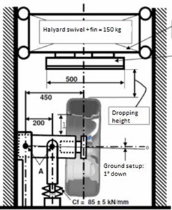 本研究使用的輪圈負載為900 kg,由此可計算衝擊能為3,870 J,搭配表5即可得到所需的初始速度及衝擊塊重量。在表5中,3,870 J 對應之最接近的衝擊能量為3,900 J,而須使用的衝擊塊重量為285 kg、衝擊速度為5.2 m/s。