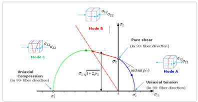 最終的損傷值會以五種模式中的損傷最大值呈現,而損傷值達到1則代表材料失效。方程式3-5中的 p 代表失效包絡線因子(Failure envelope factor),因子的+/–符號指向可參閱圖7。Radioss 使用者手冊[4]與 Puck 本人的論文[5]皆指出,以 CFRP 材料而言,![]()