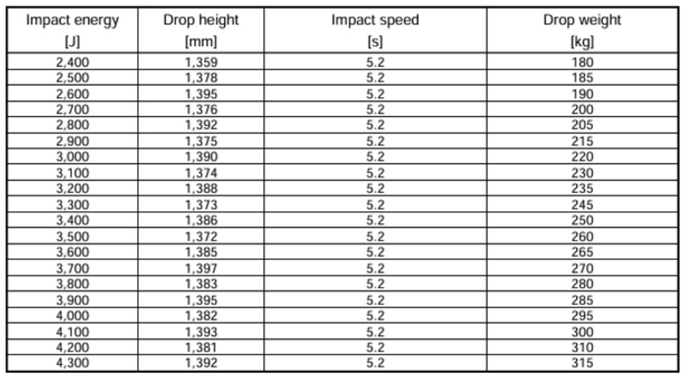 表5規範中不同衝擊能量對應的衝擊速度及落槌重量表[6]