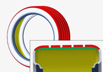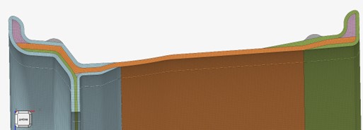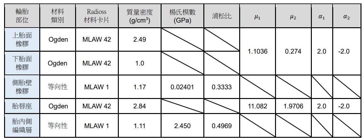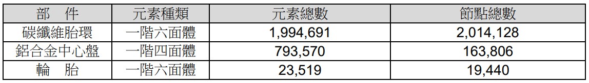 碳纖維胎環及輪胎之有限元素模型則使用一階六面體元素建立;本文的輪胎有限元素模型參考了 LS-Dyna VPG 之輪胎模型 [2],考慮輪胎內部複合之材料與結構,將輪胎分為上胎面橡膠、下胎面橡膠、側胎壁橡膠、胎唇座、胎內側編織層等五個部分並使用超彈性的M42_OGDEN 及等向性彈性的 M1_ELAST 材料卡建立。輪胎之有限元素模型與對應的材料參數,分別如圖2及表2所示。