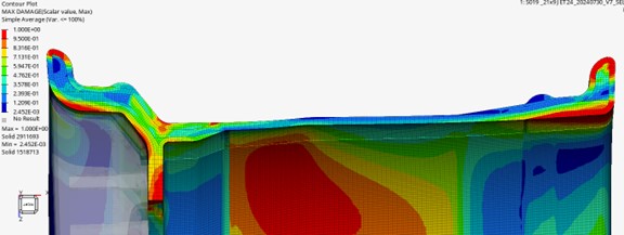 碳纖維胎環的損傷分布如圖16及圖17所示,其中紅色區域代表損傷值大於0.95的區域,由分布圖可以觀察到損傷值較高的區域並不一定是等效 von Mises 應力較高的區域,因為同樣的受力方向作用在不同疊層會造成不同的損傷值,而本文分析結果中,從圖17的 CFRP 胎環剖面可觀察到,胎環的損傷多集中在胎環表面,並沒有貫穿性的損傷。