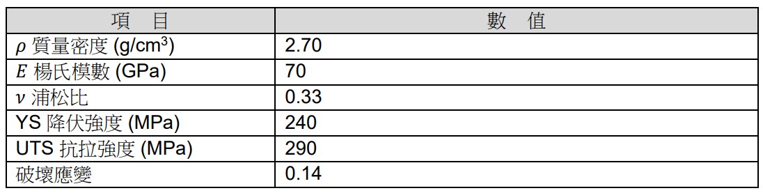 本文使用的輪圈為碳纖維-鋁合金兩片式輪圈,輪圈規格為 21×9J ET24,輪圈之設計負載為900 kg,使用的輪胎規格為 275/35 R21。網格部分主要分為鋁合金中心盤(Disk)、碳纖維胎環(Rim)、輪胎、測試及架設輪圈的設備四個部分,其中鋁合金中心盤以一階四面體元素建立,如圖1所示,材料卡使用等向性與彈塑性的 M2_PLAS_JOHNS_ZERIL,材料為 EN AW 6061-T6 [1],機械性質如表1所示。