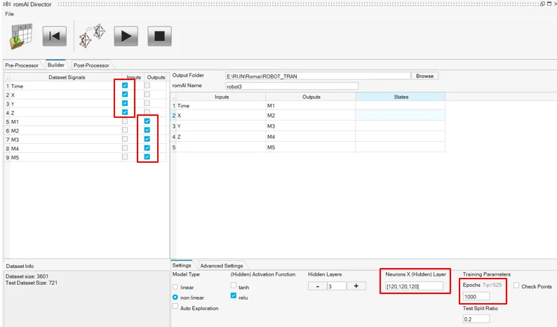 將上述的歷程資料輸入到Altair romAI中,Input為軌跡座標XYZ座標,對應Output則為5顆步進馬達的角度歷程,即可開始進行AI路徑模型的訓練。本案例romAI神經層數為3 [120,120,120]層,設置1000次跌代。