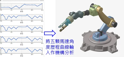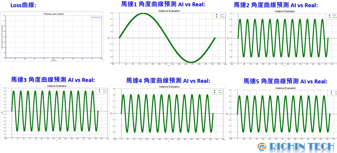 完成AI訓練模型後,只要輸入預規劃的路徑,就可獲取馬達的角度時間歷程。最終將馬達角度時間曲線輸入機械手臂中,就可讓機械手臂成功執行預期的路徑並取得精準結果。