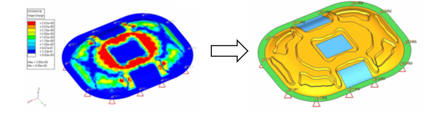 平板結構通常很薄,導致自身承受彎曲的能力很低,一般很難直接滿足結構性能需求。工程上通常通過沖壓的方式來生成「肋」的造型,以達到不增加結構厚度的情況下明顯提高結構的支撐剛性或者防止產生共振。但肋的設計往往要考量很多的參數,無論是肋的形狀、高度、密度、對稱性與工藝需求等,都讓人為的設計很難找到最優解。