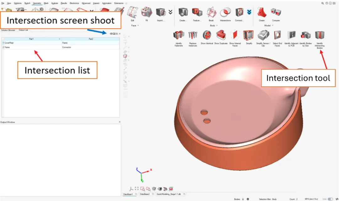 SimLab 中提供了方便的干涉檢查功能,既可以對幾何直接進行干涉檢查,也可以對網格進行干涉檢查,可以用 Geometry → Identity Intersection Bodies 或 Geometry → Intersection 這兩個檢查干涉的功能。