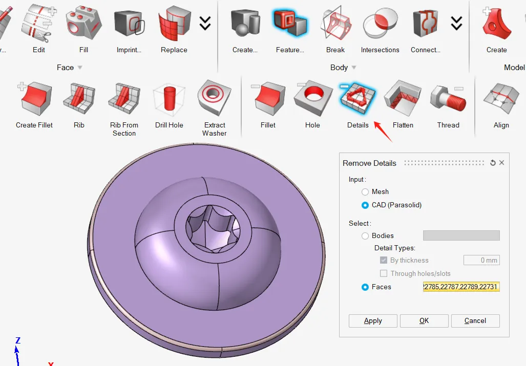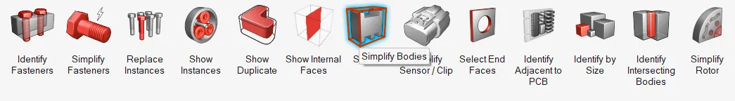 此外,在 Geometry → Body 下,還有很多幾何簡化小工具,尤其對於電子產品,例如 Simplify Fasteners,用於簡化螺栓;Simplify 功能用於簡化各種電子元器件;以及 Simplify Sensor/Clip 對感測器和一些連接件進行快速簡化。
