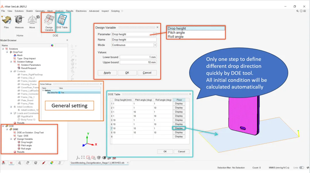 此外,SimLab 還提供了 DOE 工具,可以快速建立多個方向的落摔分析,而不需要反復的導入模型,創建地板等重複性工作。