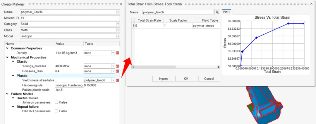 幾何清理結束後,可以進行材料選擇,需要提醒的是,目前 SimLab 中的材料模型還沒有 HyperMesh 中那麼齊全,所以對一些特殊的材料屬性,可能暫時是無法找到的。但對於我們的問題,目前主要材料為塑膠和金屬,用的均是彈塑性模型,因此是可以在 SimLab 中進行設置的,下面是一個根據應力應變曲線設置的彈塑性材料的例子。